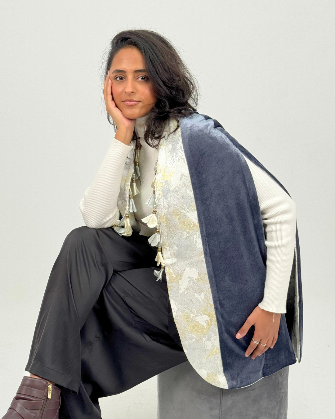 A reversible double-face cape with two wearable sides in blue-grey velvet and other side with soft cream and gold touches, sides finished with subtle tassels