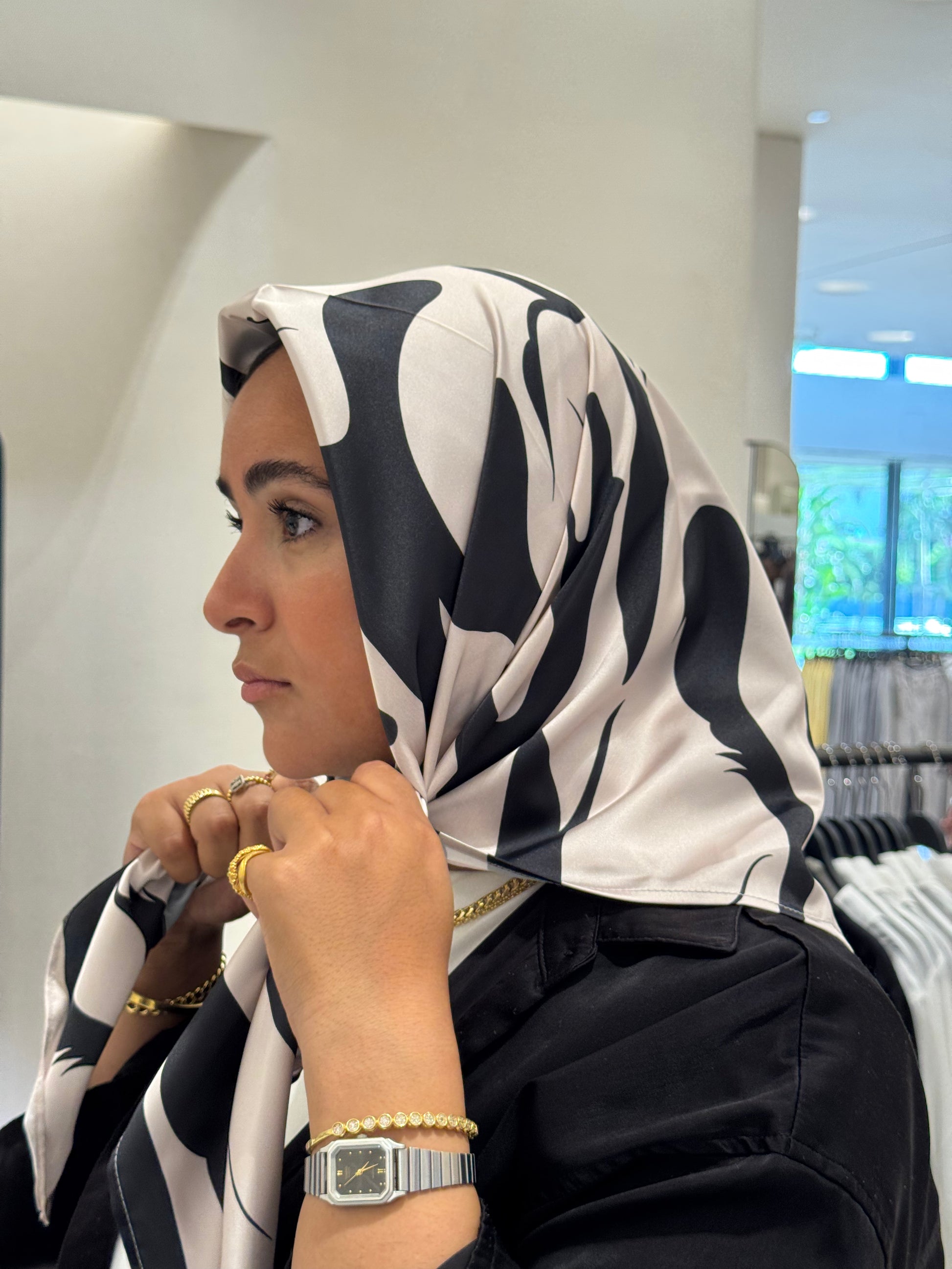 Square ultra-soft silky-satin finish scarf crafted from premium satin. Wear it your way; around the neck, as a hijab, or as a statement accessory for timeless femininity with an edge!