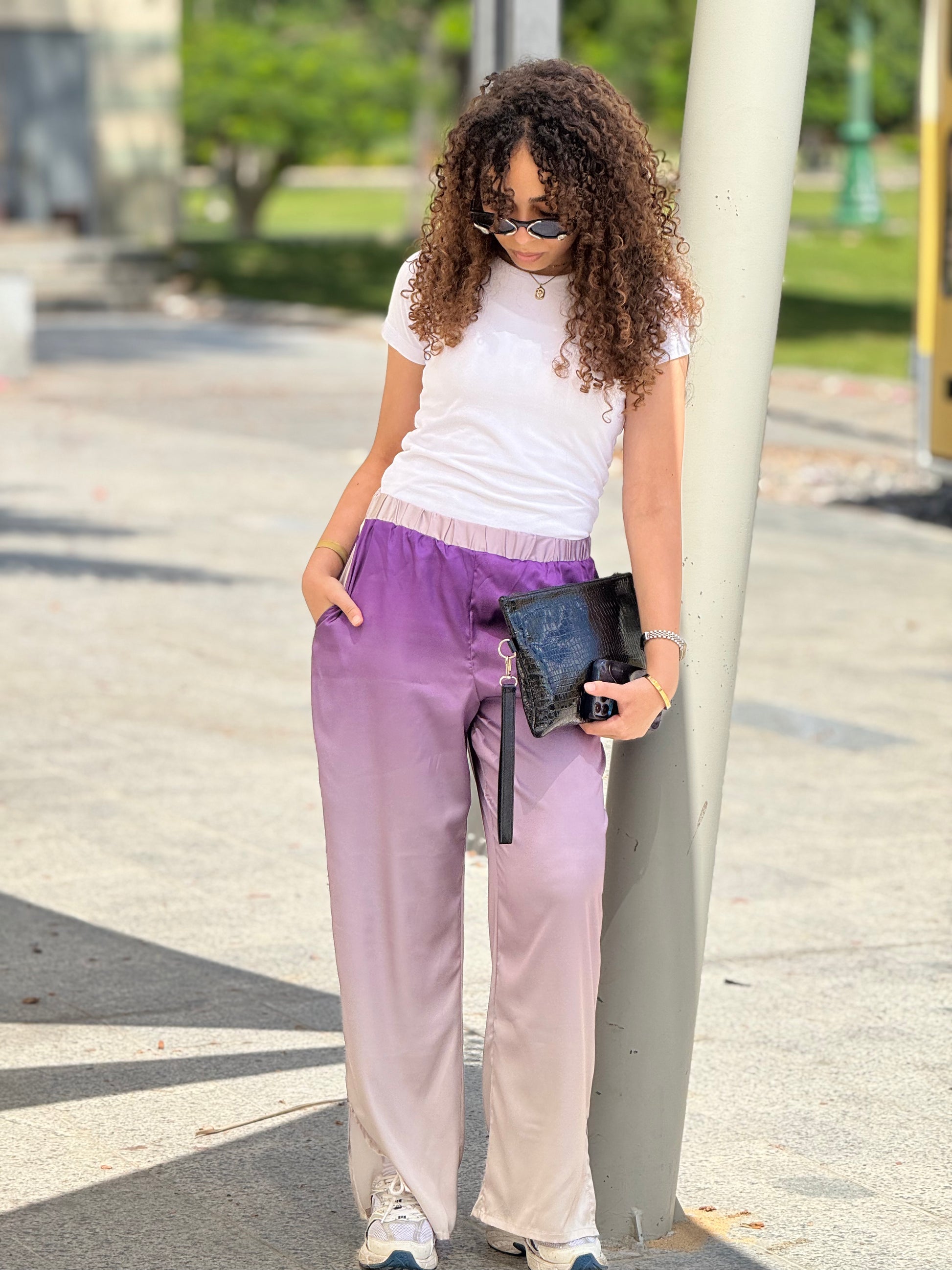 The Mauve-to-Cream Ombré wide-leg pants are designed in a satin ombré gradient — featuring a side slit for ease and flow, balancing elegance with playful edge.