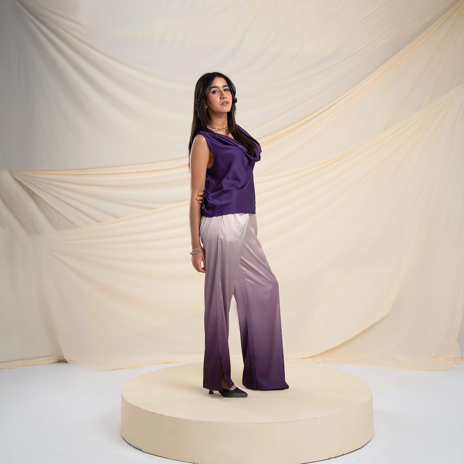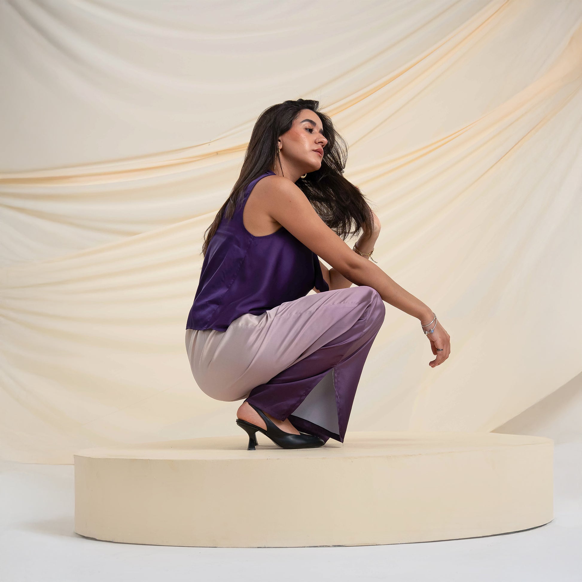 The Cream-to-deep Mauve Ombré wide-leg pants are designed in a satin ombré gradient — featuring a side slit for ease and flow, balancing elegance with playful edge.