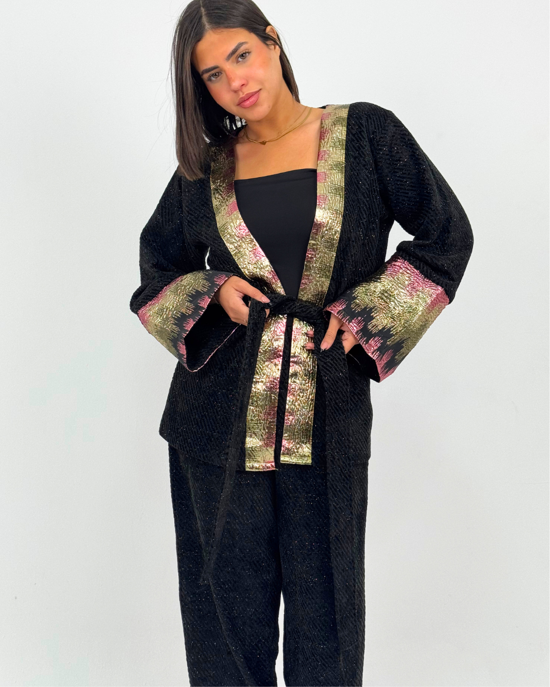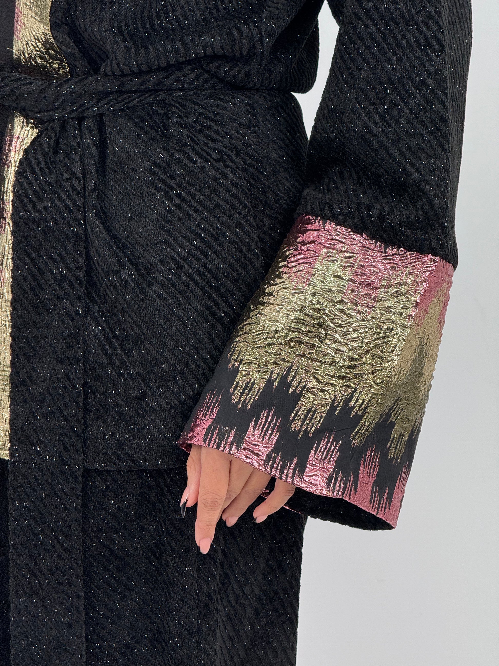 Two-piece shimmery black velvet set with belt designed for Ramadan nights. The set is elevated with statement metallic sleeves in gold and soft blush tones.