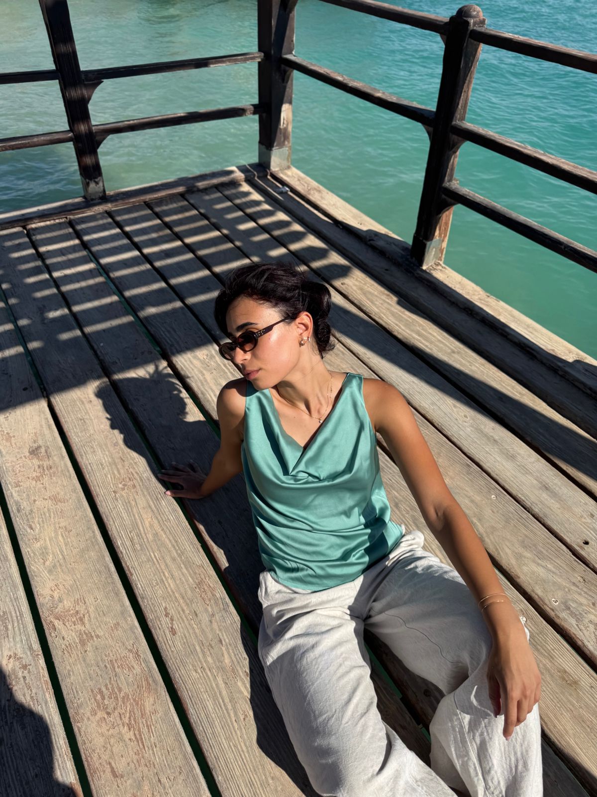 A soft satin top with a draped cowl neckline in Dusty Mint color. Lightweight, elegant, and easy to style for both day and night.